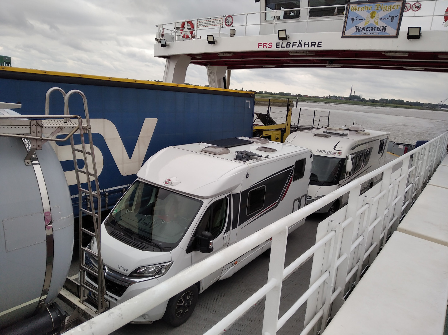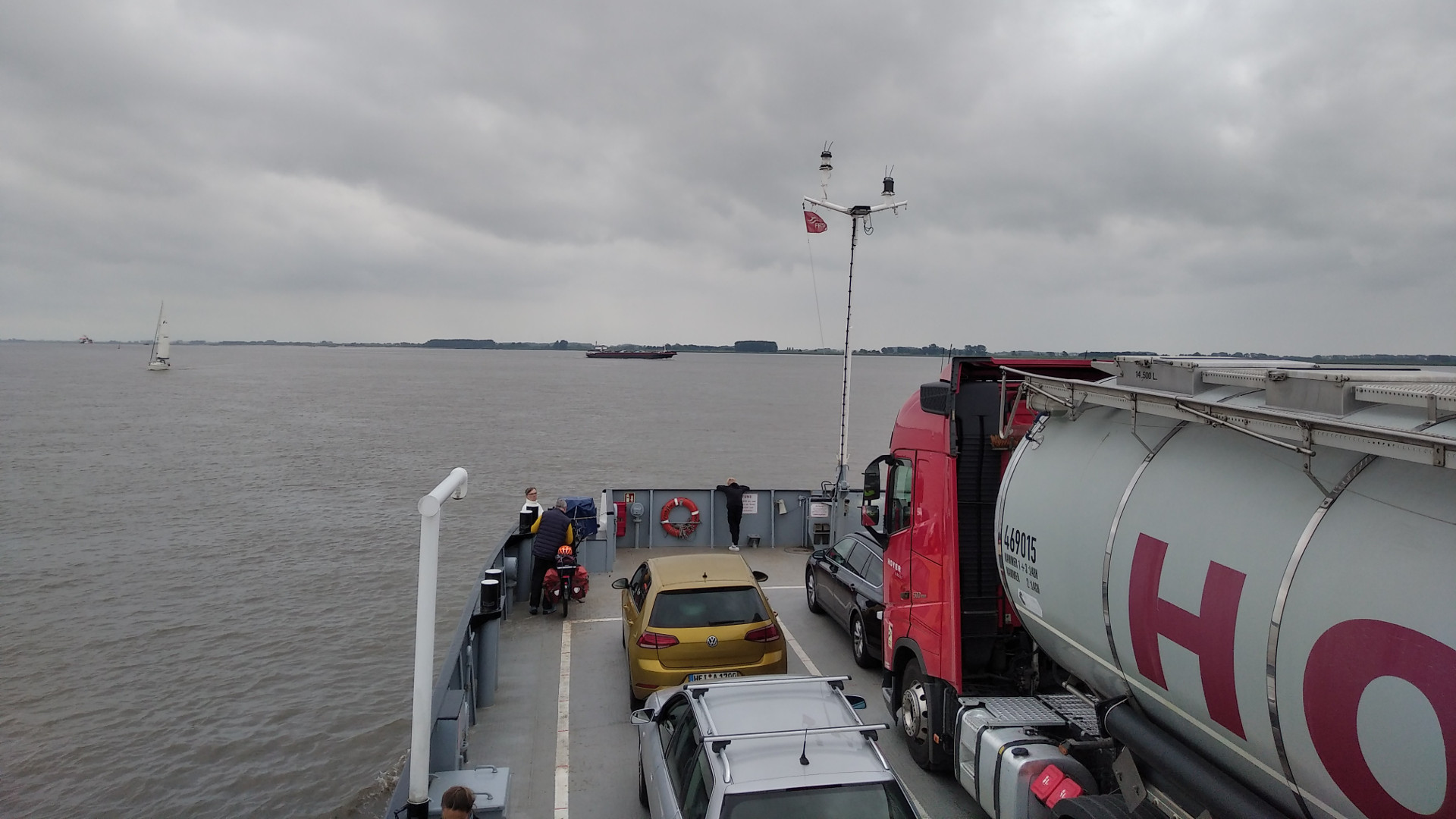 | 27.07 | 1 Nacht | Oederquart | Ich hätte mir ja denken können, dass ich nicht der einzige bin, der die Strecke zum Elbtunnel meiden will. Die Wartezeit betrug 1 1/2 Stunden, obwohl 4 Fähren im Einsatz waren. Aber die Überfahrt selbst ist immer wieder toll. Auf der anderen Seite eine andere Welt. Es ist gleich viel ländlicher, aber auch viel zersiedelter. Und ich bin natürlich jetzt wieder in Niedersachsen. Auf der Fähre |